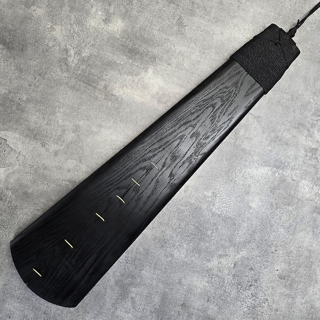 The artwork features a blackened finish, achieved through a traditional burning process that deepens the natural grain before being stained. This texture symbolizes the transformative power of fire—representing the endurance of hardship and the strength found in what remains.